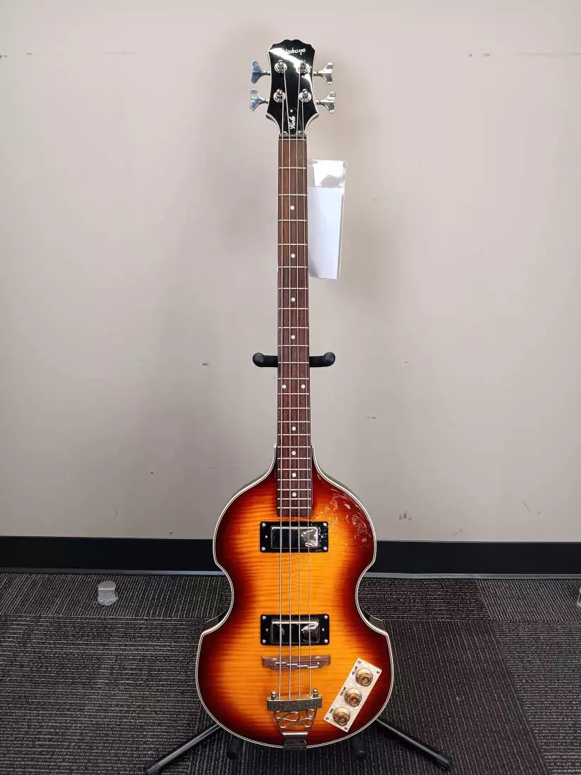 This veteran from the British invasion is back without the vintage price tag! Mod looks and warm, bass tone come together as a result of its hollow laminated Maple body with a short-scale 30" Maple neck, elegant Flame Maple top and dual bass Mini-Humbucking pickups.