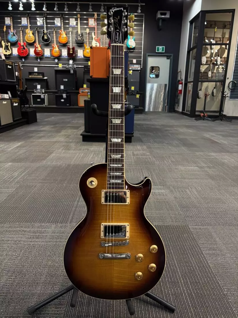 The Les Paul guitar that established the legend, with the power, look and feel of the world's most desirable dual-humbucker electric guitar. The Les Paul Traditional retains the archetypal feel of the vintage Les Paul guitars in its rounded neck profile, solid rosewood fingerboard and on-weight relieved body. Traditional looks are complemented by the legendary tonewood combination of a mahogany body and AA figured maple top, vintage style tuners and ABR bridge and nickel-plated hardware. Classic PAF tones are enhanced by hand-wired electronics including Orange Drop capacitors.