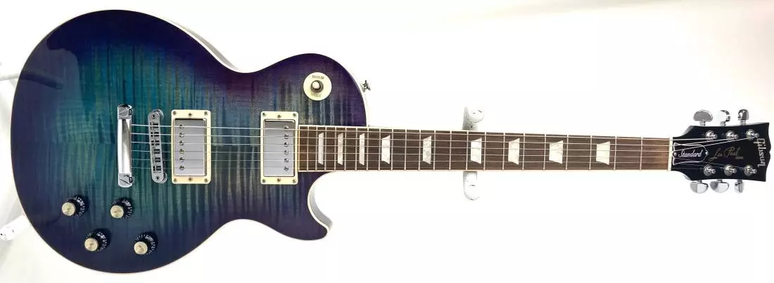 The Les Paul Standard 2017 T benefits from several groundbreaking updates. New Ultra-Modern weight relief allows for comfortable play and greater sonic depth. A luscious Grade-AAA flame maple top harks to the classic beauty of the Burst. An asymmetrical slim-taper neck profile with a compound-radius fingerboard and rolled binding team up for outstanding comfort, speed and bend-ability. And push-pull switching on all four knobs for coil tapping on both pickups, a pure bypass, and phase reverse all combine in a truly modern Les Paul that still looks legendary. This stellar guitar is delivered in a classic brown Gibson hardshell case.