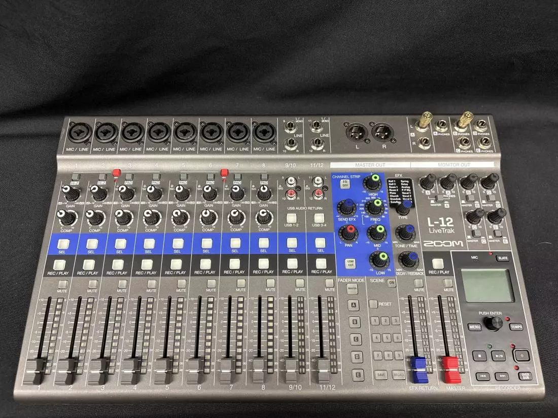 Effortless Live Mixing - LiveTrak's 12 discrete channels (eight mono plus two stereo) have a 3-band mid-parametric EQ and 16 built-in send effects. Its eight mono channels also have a dedicated compressor. With all these controls plus its 12-segment LED metering, the L-12 offers just what you need for intuitive mixing.