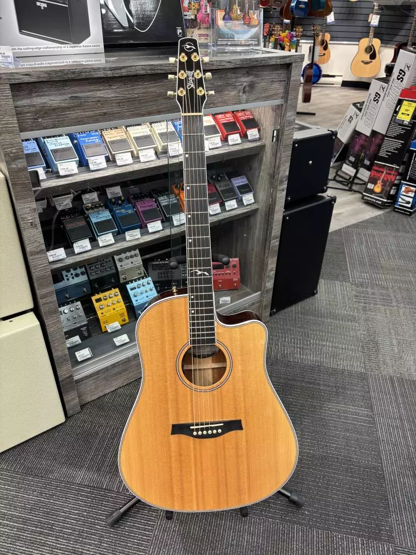 The Seagull Artist line is renewed with the addition of the Artist Mosaic CW HG EQ. Offering a complete array of features, this guitar checks all the boxes for the pro musician with a shimmery natural finish, a full bodied dreadnought high-gloss mahogany body shape for exceptional tone and projection, an ample cutaway for easy upper fret access, a highly vibrant and resonant solid spruce top, new Seagull Artist inlays, discretely placed LR Baggs Anthem system, and utmost attention to detail and build quality.