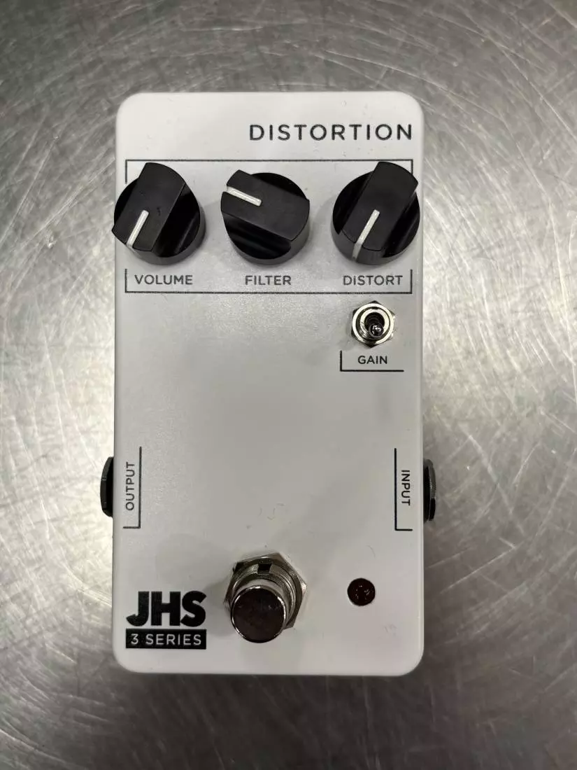 The JHS Pedals 3 Series Distortion is a massively versatile distortion pedal with the ability to achieve medium gain crunch, heavy overdrive, distortion, and even fuzz tones. The controls on the Distortion are Volume, Filter (or Tone), and Distort knobs that give you a wide range of usable sounds in any position. The Gain toggle gives you a choice between more saturated and compressed or a more open and crunchy distortion. This switch plays a big part in how the pedal responds to your playing and touch dynamics.