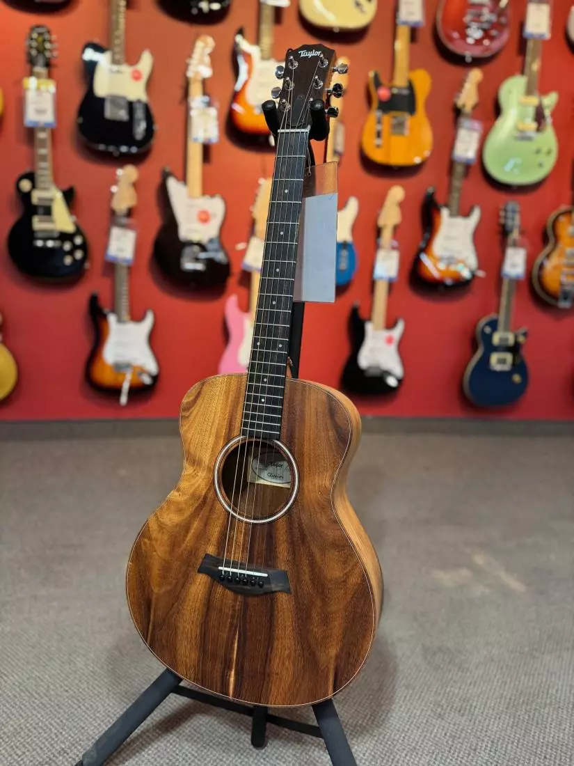 This alluring all-koa version of the GS Mini pairs a solid koa top with layered koa back and sides, serving up an inspiring blend of looks, feel and sound. The compact Mini's scaled-down design delivers ultra-portability for players on the go and couch-friendly comfort for picking at home, while the rich, bold sound punches well above its weight for a smaller guitar. The patented neck design guarantees signature Taylor playability, and the shorter 23.5-inch scale length makes forming a chord a breeze. The built-in ES-B pickup offers clear, natural amplified tone and includes a digital tuner with an easy-to-read LED display. The GS Mini-e Koa ships with a structured gig bag.
