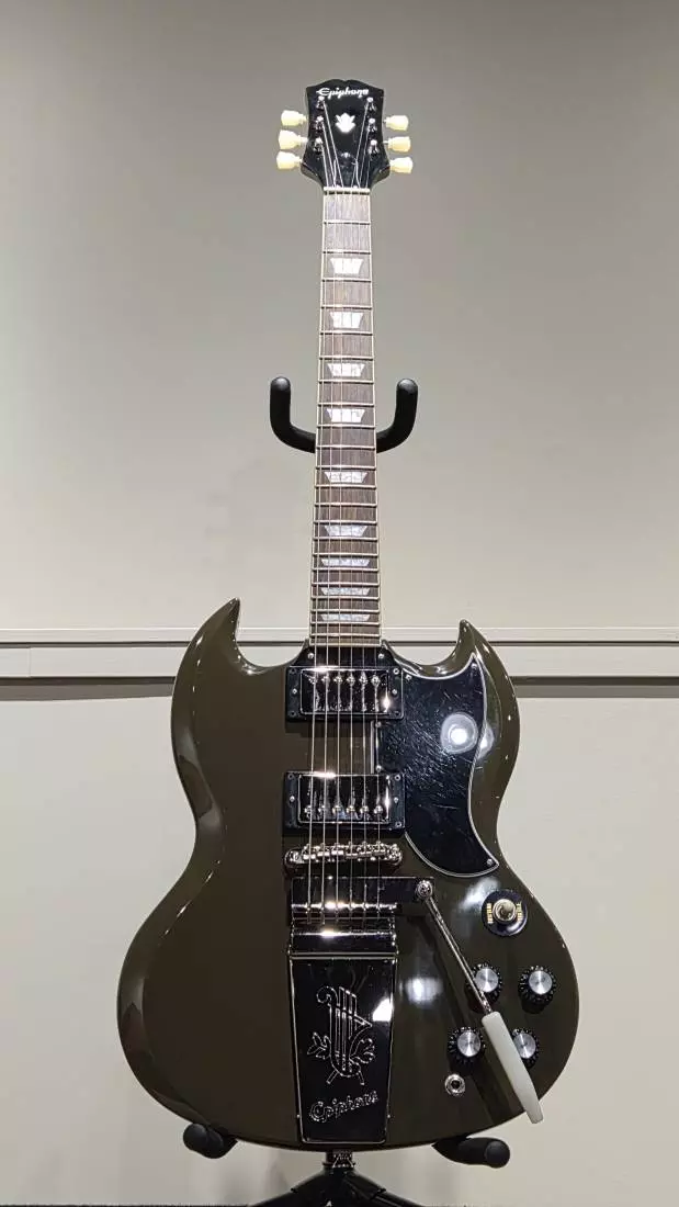 The Epiphone SG™ Standard 61 Maestro™ Vibrola from the new Inspired by Gibson™ Collection recreates the original SG from 1961 with a newly designed 60s style Maestro Vibrola. Featuring a classic mahogany body in an Olive Drab finish and powered by ProBucker™ humbuckers with CTS® potentiometers. (Previously called SG Standard '61 Maestro Vibrola)