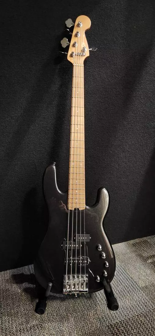 A Charvel HiMass™ bridge, Graph Tech® TUSQ® XL nut and opengear tuners combine for stellar tuning stability with improved note punch and sustain. This 5-string, 34"-scale bass is presented in Metallic Black or Platinum Pearl finishes with chrome hardware, black pickup covers and licensed Fender® Precision Bass® headstock shape.