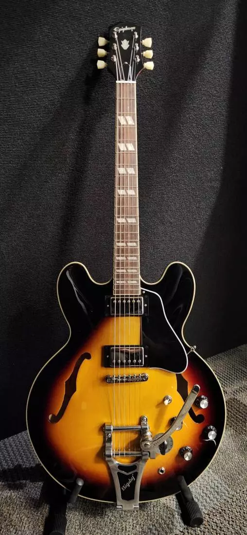 This ES-345 has a 60s Kalamazoo-style headstock that is adorned with a mother-of-pearl Epiphone logo and Gibson Crown inlay. For the electronics, it is equipped with a pair of Epiphone's acclaimed Alnico Classic PRO™ pickups that are wired to individual volume and tone controls. along with a three-way pickup selector switch that lets you use either pickup by itself or combine them in any ratio that you prefer. A 6-position mono Varitone switch provides even more tonal flexibility. A premium gig bag is also included to keep this beauty safe when it's not in use.