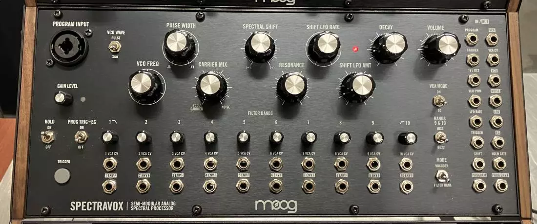 An analog spectral processor based around a 10-band filter bank, Spectravox creates lively drones and colorful tonal sweeps on its own and adds resonant depth and psychedelic spectral movement to any external sound. Hook up a microphone and Spectravox becomes a 10-band analog vocoder with innovative integrated modulation of all of its filters. An exploration and expansion of the topology of the vocoder and filter bank, Spectravox is a highly flexible instrument and signal processor with a comprehensive patch bay for integration into studios of all sizes.