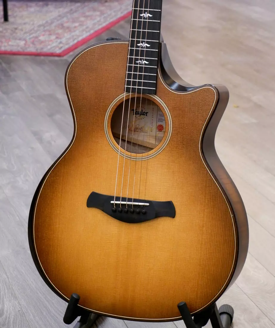 The V-Class architecture improves the volume, sustain and projection, and creates more harmonic agreement between notes by putting the top more in tune with the strings. Using their proprietary roasting process for the Sitka spruce top lowers the damping effect and helps deliver a more played-in tone. Ergonomic body details (exclusive to Builder's Edition) include a beveled armrest with beveled body edge treatment; a double-carved cutaway that allows fluid access to the higher frets without the need to change one's hand position; and a new Silent Satin finish, which reduces contact noise for a cleaner overall sound. Gold Gotoh 510 tuners (featuring a 21:1 gear ratio) complete the suite of tactile delights. Striking aesthetic details include a new Wild Honey Burst on the back, sides and neck, mother-of-pearl Sceptor fretboard/peghead inlay, and inset maple/black body purfling with matching rosette. The guitar comes equipped with Taylor ES2 electronics and ships in a deluxe hardshell case.