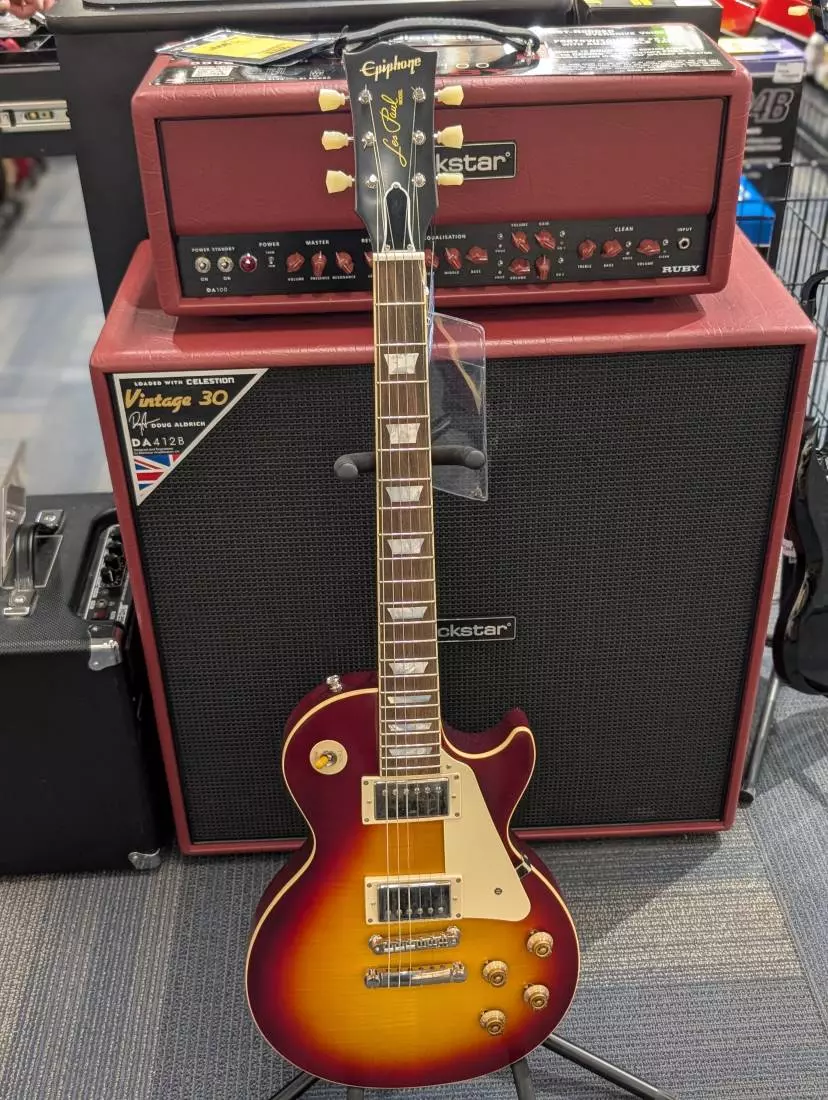 Made in collaboration with the Gibson Custom Shop, the Epiphone 1959 Les Paul Standard is Epiphone's incredible recreation of the rare vintage classic, updated to be more authentic and true to the originals than ever. It features a mahogany bodywith a maple top with a AAA flame maple veneer,a one-piece mahogany neck with a comfortable '59 rounded, medium C profile, long neck tenon, and Gibson-style "open book" R9 headstock shape, VOS (Vintage Original Sheen) finish, Gibson Custombucker humbucking pickups, Switchcraft® selector switch and 1/4" output jack, CTS pots, 50s era wiring, Mallory capacitors, non-beveled pickguard, Epiphone Deluxe vintage tuners with Keystone buttons, and a vintage-style brown and pink hardshell case. Play one today, and prepare to be amazed!