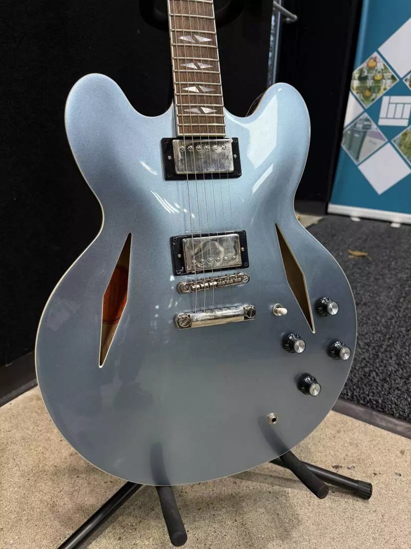 Now Epiphone is extremely proud to once again partner with the Gibson Custom Shop on the release of the Dave Grohl DG-335. It features the combination of ES-335 and Trini Lopez model features Dave requested and that fans expect, including a semi-hollow ES™ body with bound diamond-shaped sound holes, a one-piece mahogany neck with an elliptical profile, Trini Lopez style heads tock with Grover Mini Rotomatic tuners, laurel fretboard, and split diamond inlays.