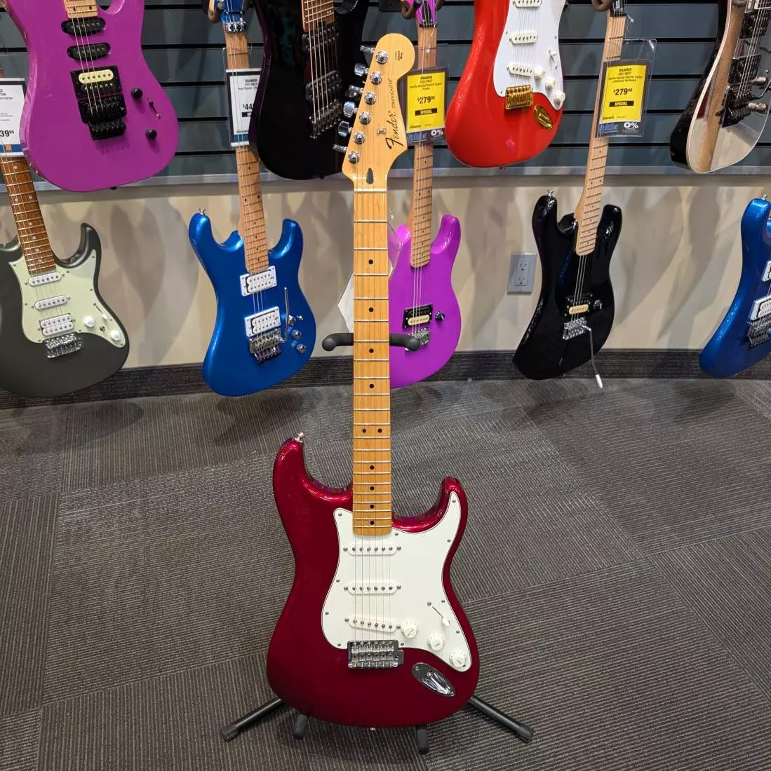 The Standard Stratocaster guitar offers legendary Fender tone with classic styling. Features include three single-coil pickups, synchronized tremolo with high-mass bridge block, tinted neck, shielded body cavities, medium jumbo frets, parchment pickguard and 70s-style headstock logo.