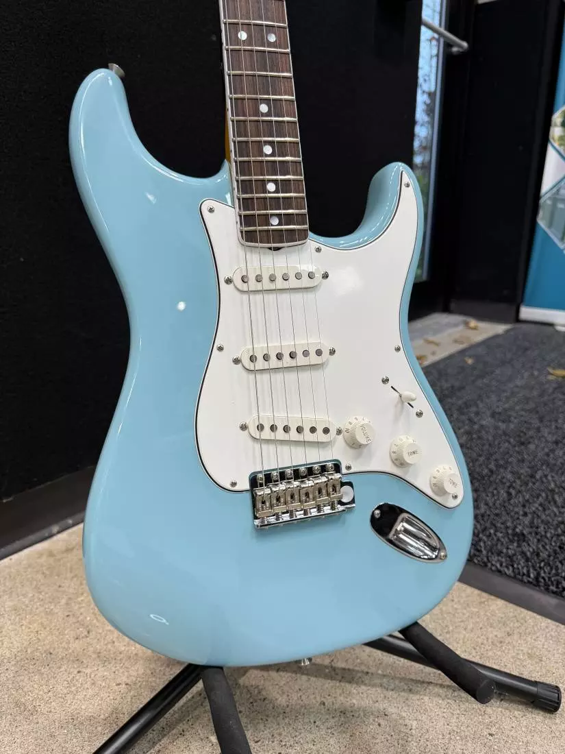 There is no greater example of guitar hero Eric Johnson's devotion to his art than his signature model Stratocaster guitar. With singular attention to detail, the Eric Johnson Stratocaster Rosewood features a two-piece alder body finished in nitrocellulose lacquer, quartersawn maple neck with bound round-laminated 12"-radius rosewood fingerboard, three-ply parchment pickguard, pickups voiced by Johnson himself, staggered vintage-style tuners, and custom tremolo block. Deluxe blonde hardshell case included.