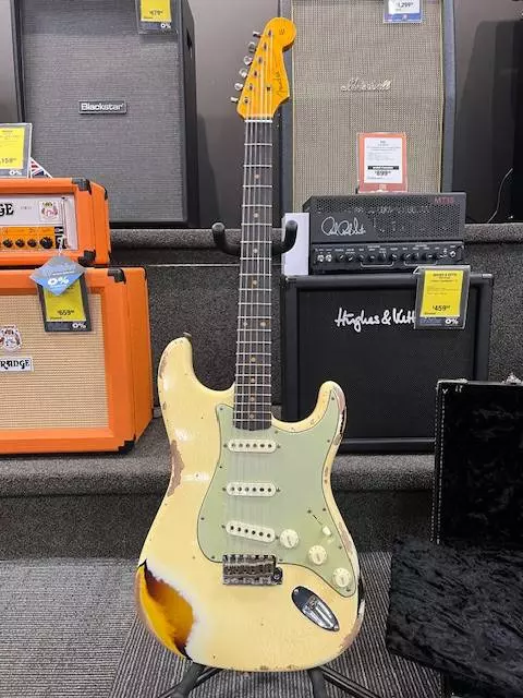 The '61 Strat Heavy Relic takes you back to a special time during the evolution of the venerable model when Leo Fender was constantly modifying, progressing, innovating and perfecting. 1961 was the final year of the round-lam or "slab" rosewood fingerboard, ushering in a new era of '60s Strats along with many other changes and upgrades. On this model, a two-piece select alder body wears a well-worn Heavy Relic lacquer finish, and the quartersawn maple neck has a '60s-style "oval C" profile, 9.5"-radius flat-lam rosewood fingerboard, and 21 Jumbo frets for classic feel and gigantic bends.