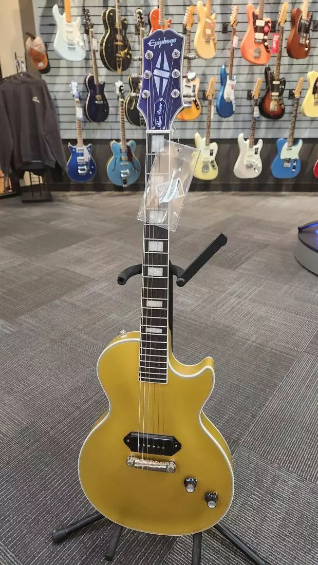 The Jared James Nichols Gold Glory Les Paul Custom is a new take on the Black-finished "Old Glory" signature model by the rising star from Les Pauls hometown. Jared James Nichols Gold Glory features a classic 1955-style Les Paul Custom body with a distinctive Double Gold Aged finish, a single Seymour Duncan® P-90 Dogear pickup, an ebony fingerboard with traditional block inlays, Grover® Rotomatic® tuners, and EpiLite™ case. Available for a limited time.