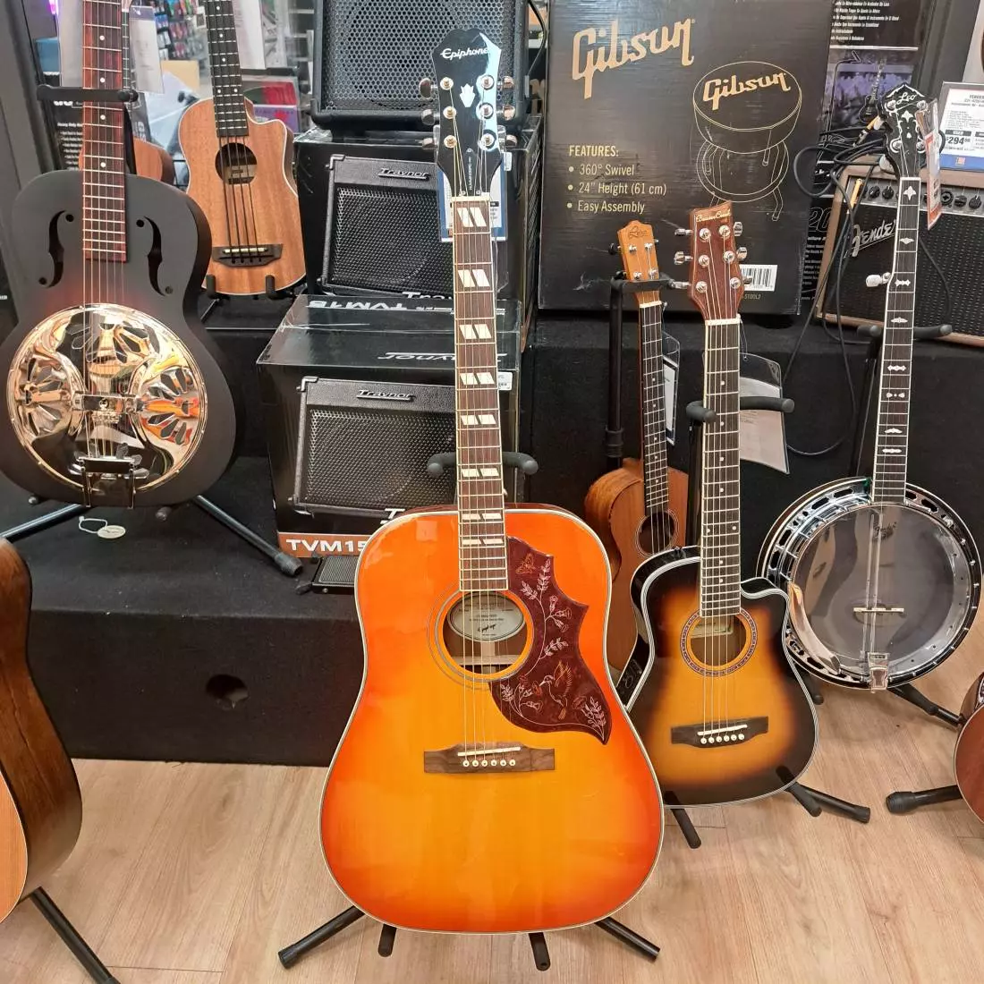 The Hummingbird Studio Acoustic/Electric updates the 60s classic with a solid spruce top, mahogany neck and body, Grover® Rotomatic® 18:1 ratio tuners, traditional binding and historic Hummingbird pickguard, and Fishman™ Sonitone™ electronics.