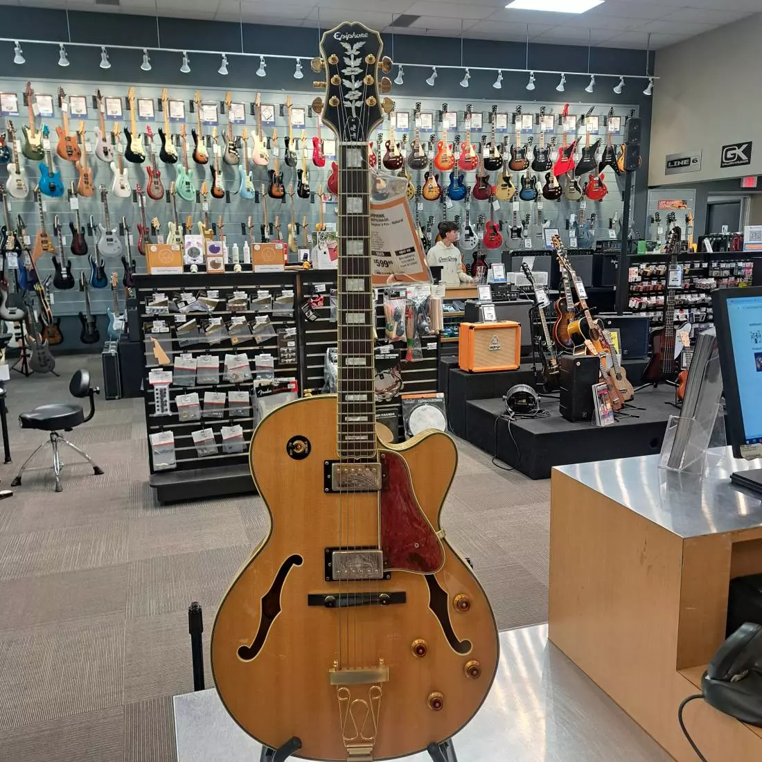Each ProBucker pickup's volume and tone are attenuated by Top Hat control knobs with metal inserts that are spaced slightly farther apart than a typical archtop along with a 3-way pickup selector with an ivory-colored toggle cap.