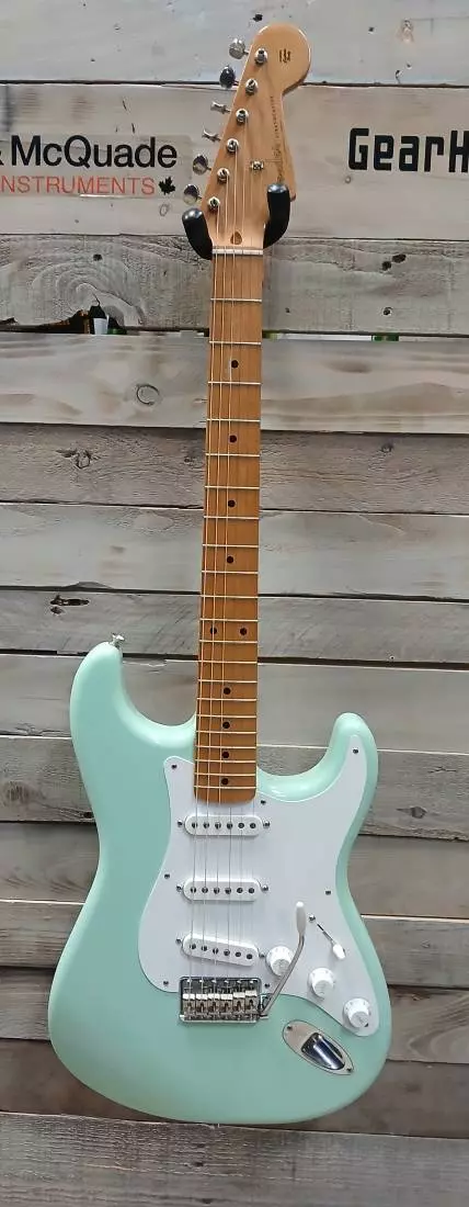 The Classic Series '50s Stratocaster guitar epitomizes the vibe of the '50s. The color selection alone - Surf Green, Daphne Blue and Fiesta Red - takes you back to the era of diners, Ike and cars with fins. With a maple fingerboard, tinted neck, single-ply pickguard and aged plastic parts, it's authentically retro.