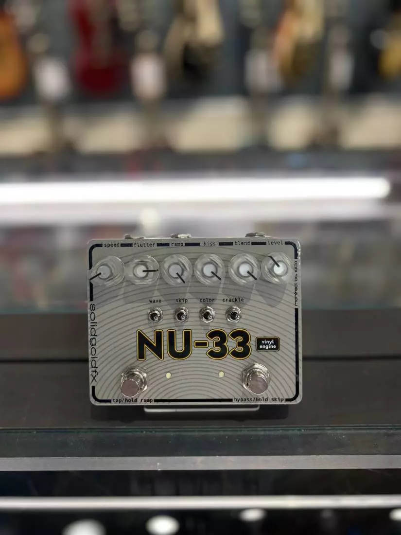 Named after the Greek letter symbolizing spatial frequency and the RPMs of a turntable, the NU-33 is a lo-fi Vinyl modulator like no other. Designed to capture the vibe of some our favorite records such as a particularly worn out copy of Black Sabbath's Master of Reality and an original pressing of Led Zeppelin I with just the perfect amount of static, the NU-33 serves up chorus and vibrato mixed with tastefully engineered hiss, crackle and pops to give your riffs just the right touch of vintage flair. The controls allow you to choose how much or how little flutter to add to your tone, color it with 2 additional filter modes, shape it with 3 different waveforms and dial in the mix with an analog blend; you can easily make this pedal sound as pretty and lush or as dark and sombre as you please.