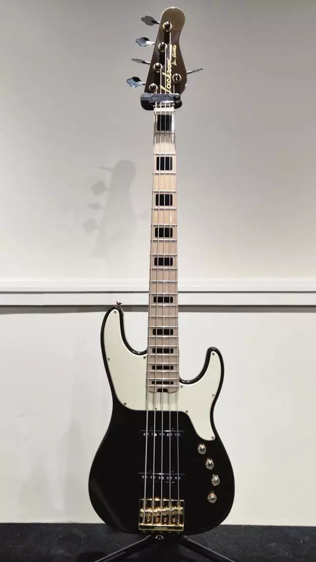 The Adam Blackstone "Gladys" Jackson Pro Series Signature Concert bass ups the ante in the style realm with all-new vivid black stone finish, creme pickguard, black block inlays, a mixture of black and gold hardware, dome-style control knobs, Jackson 4-and-one color matched paddle headstock and a gig bag. Highly affordable, this is the perfect bass for the musician who requires nothing less than the latest in high-performance bass technology.