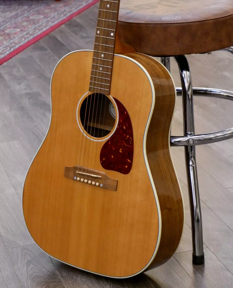 Turn heads with this unique J-45 Studio. Hand built using walnut back and sides with a Sitka spruce top. The slim body depth allows for increased comfort underarm and the flatter fingerboard allows a finer playability. Available in both Antique Natural and Walnut Burst finishes and finished with an active under-saddle piezo pickup for easy studio quality plug and play anywhere!