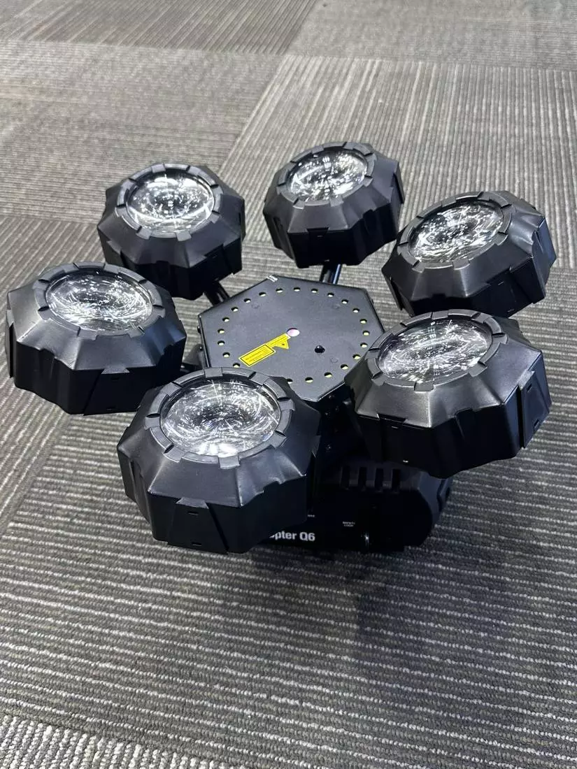 Helicopter Q6 is a multi-effect effect light designed to dazzle and energize the dance floor. It features adjustable RGBW beams, a round SMD strobe and a red/green pattern laser on a rotating base with continuous pan rotation creating unique and amazing effects. Its narrow, razor-sharp beams of RGBW light create astonishing aerial effects and the rotating red and green laser produces thousands of razor sharp beams that cover a large area. Helicopter Q6 is easy to control using automated and sound-activated programs, master/slave, DMX or an optional IRC-6 remote.