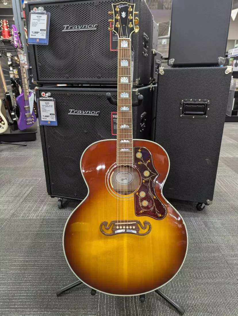 The legacy of Gibson's "King of the Flat-Tops" lives on in the SJ-200 Standard. From its inaugural appearance in 1937, Gibson's SJ-200 set an unmatched standard. The SJ-200 continues a legacy of the world's most famous acoustic guitar, and certainly one of the most popular. The body features flame maple and is finished in Ebony. It comes equipped with gold Grover® Rotomatic® tuners, a TUSQ® nut, saddle, and bridge pins, and it is stage and studio-ready with an internal LR Baggs™ Anthem mic/pickup system. A Gibson hardshell case is included.