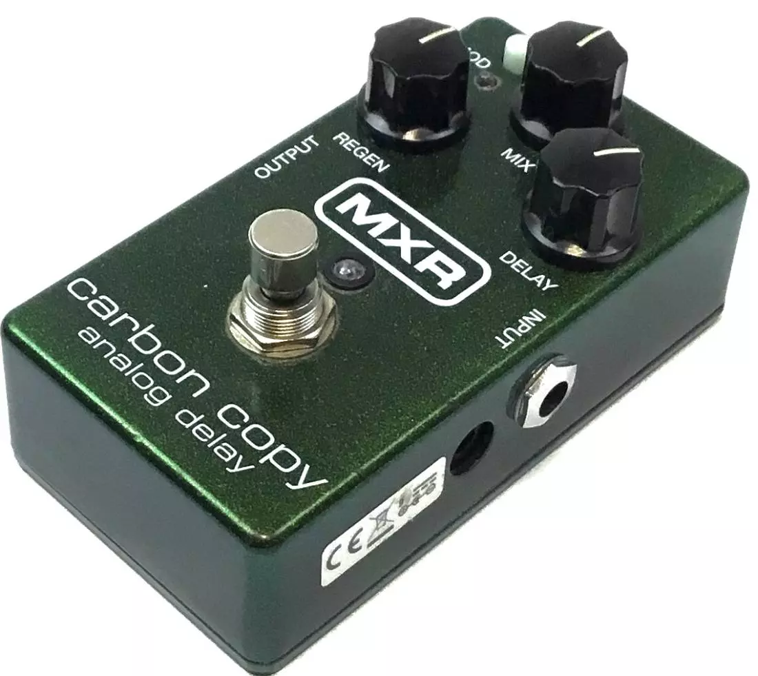 The MXR Carbon Copy Analog Delay Pedal features a completely analog audio path for the ultimate in rich, warm delay-made possible only by old-school bucket brigade technology. This design boasts an amazing 600ms of delay time with optional modulation via a top-mounted switch and a simple, three-knob layout that controls Delay time, Mix (dry/wet blend), and Regen (delay repeats)-all in a pedal no bigger than a Phase 90. In addition, the M169 pedal has two internal trim pots that offer user-adjustable width and rate control of the modulation for even more tonal options. The Carbon Copy effect pedal will take you from crisp "bathroom" slap echoes to epic, Gilmour-esque delays with a twist of a knob. True hard-wire bypass, single 9-volt operation, and stage-ready blue LEDs round out the package.