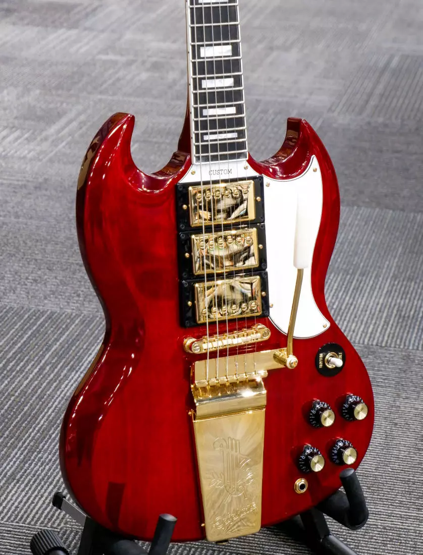 Renowned guitarist Joe Bonamassa is also a world-class guitar collector. One of his prized acquisitions is a 1963 Gibson SG™ Custom with some unusual features, including a unique smoothly contoured neck heel joint and a Dark Wine Red finish - a rarity for that model and year. Epiphone's Joe Bonamassa 1963 SG Custom faithfully recreates the magic of this unique guitar. It features the same smooth neck joint contour, a Maestro™ Vibrola™, classic SG Custom cosmetics, gold plated hardware, and three powerful Epiphone ProBucker™ pickups. It comes with a Custom hardshell case with a goldenrod plush interior and Epiphone and Joe Bonamassa exterior graphics, plus a certificate of authenticity.