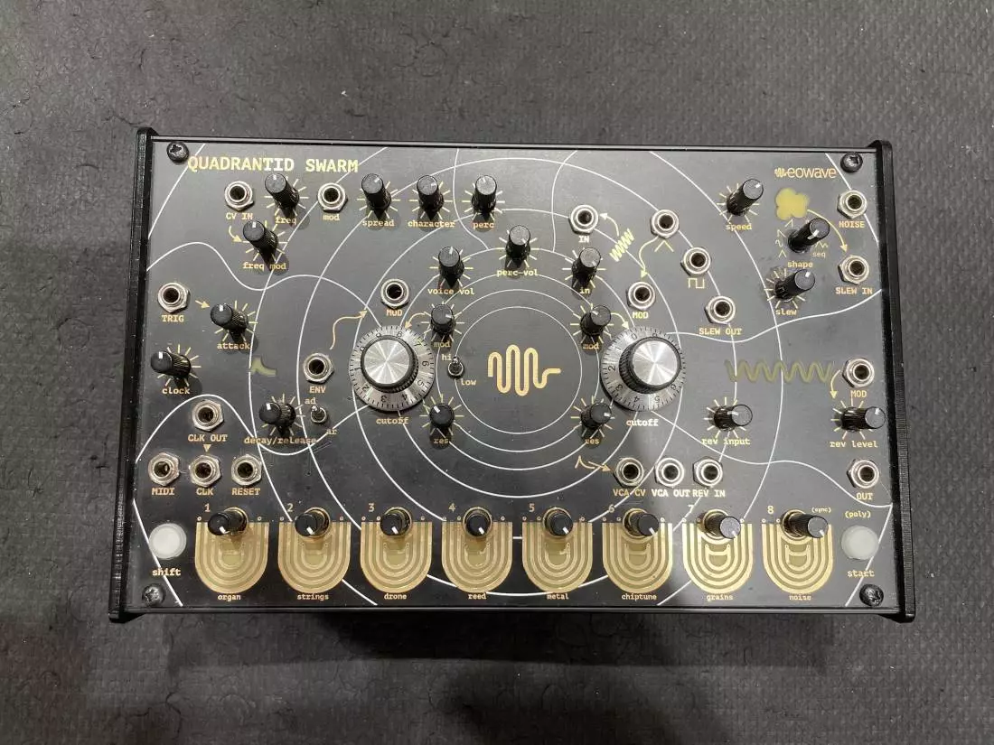 The Quandrantid Swarm has MIDI and CV/Trig connectivity. Its normalized pre-patching allows you start creating immediately, but its semi-modular design allows you to use patch cables to explore the potential of this instrument.