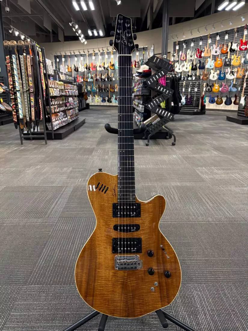 The Richlite® fingerboard is shaped with Godin's ergocut technique and equipped with medium jumbo frets. The body is made of a silver leaf maple center with poplar wings and is topped with a Premium grade veneer of highly figured Koa.