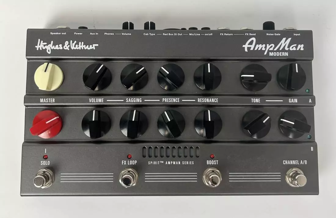 Hughes & Kettner's all-analog Spirit Tone Generator is now available in a compact pedal format. AmpMan Modern's two distinctive channels each embody an entire era of legendary guitar tones, served up by the built-in 50-watt power amp or the integrated Red Box AE+. With connoisseur tone-shaping capabilities, impressive power and a comprehensive set of professional features in a handsome little box, AmpMan is the go-to solution on stage, at home and in the studio.