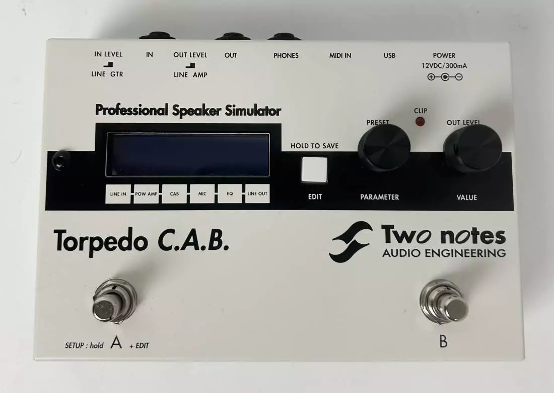 The Torpedo C.A.B. (Cabinets in A Box) is a high-end cabinet simulator in a stompbox format. It includes all the great features of the Torpedo Live, without the loadbox but with an input stage specifically tailored to accept pedal-level signals. The Torpedo C.A.B. comes with a large library of 32 cabinets and 8 microphones among the most commonly used models in the world. The virtual miking is achieved by choosing one cabinet and one microphone, and fine-tuning the position of the microphone in front of the cabinet. The Torpedo C.A.B. allows the user to assume the role of the sound engineer in a professional studio.