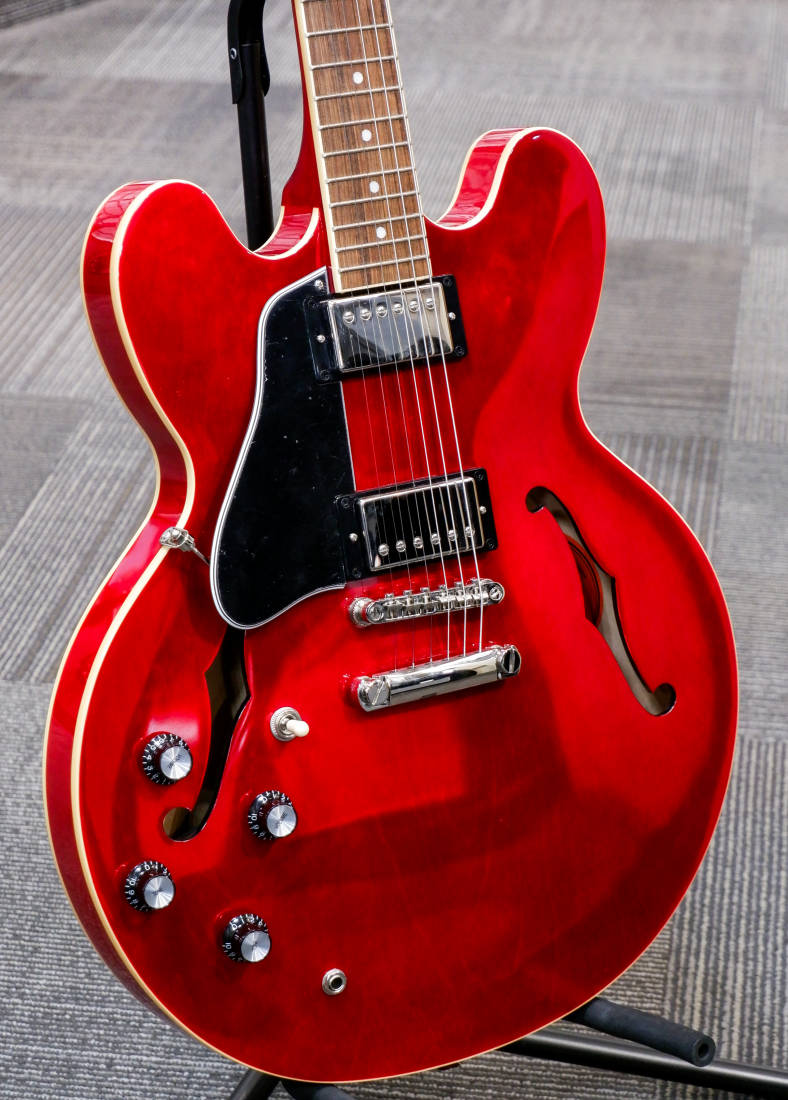 The ES-335 is Epiphone's version of the historic ES-335 that has been wowing guitar players all over the world for over six decades. From its inaugural appearance in 1958, the Gibson™ ES-335 set an unmatched standard. This Epiphone ES-335 is no exception. It is simply one of the best deals today for guitar players who want the classic sound of an ES-335 at an accessible price. The ES-335 is crafted with a layered maple top, back, and sides coupled with a solid maple tone block to create the amazing sustain, warmth, and resonant tone that players crave in a semi-hollow instrument. Epiphone's Alnico Classic PRO™ Humbuckers deliver a wide range of vintage sounds while the rounded C neck profile is extremely comfortable and easy to play, and the headstock features the 60s style Kalamazoo shape.