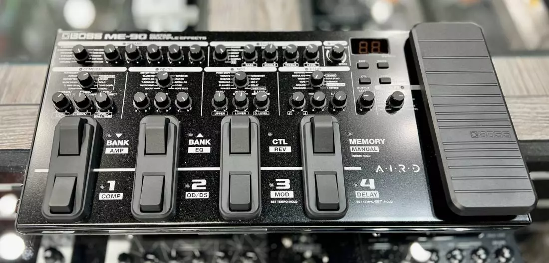 The ME-90 features eight footswitches with smooth, quiet operation and an expression pedal with an integrated toe switch. Use Memory mode to call up complete patch setups with the footswitches, and then switch to Manual mode for direct on/off control of each effect category within the patch. The footswitch LEDs light in different colours for quick identification in the heat of a performance. It's also possible to set all LEDs to light in a fixed colour for each mode if desired.