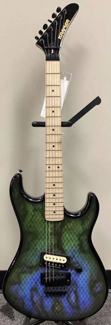 Retro fashion trends wouldn't be complete without some snakeskin, and this Baretta, with "Viper" graphics designed by Kramer Custom Graphic Artist Chris Stemmer, really delivers! Shredders chose to rock snakeskin boots, belts, and, of course, snakeskin Kramers! The Baretta is a tribute to one of the most iconic and original guitar designs in rock. Features an alder body, satin-finished hard maple neck, a single Seymour Duncan® JB™ zebra-coil humbucker™, and a Floyd Rose® 1000 series tremolo with an R2 1000 series locking nut. It is finished in an eye-catching Snakeskin Green Blue Fade.