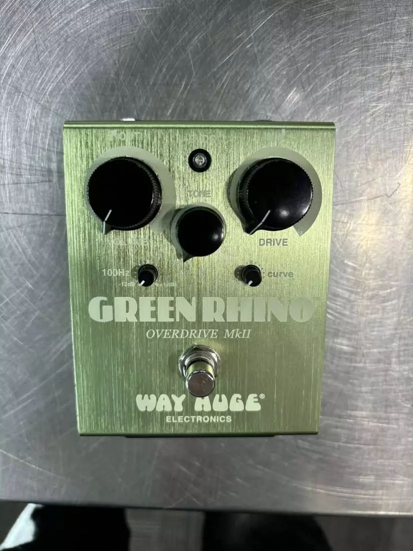 The legendary Way Huge Green Rhino has returned! The Mk II has all the gorgeous classic overdrive that you crave but it has evolved to include cool new features that make it even more rhinoceriffic. In addition to the Volume, Tone, and Drive controls, you get a 100Hz EQ knob to cut or boost your low end by 12dB. Your low notes can either shake the ground like a stampede across the savannah or cut through the mix like a charging rhinos horn. This pachyderm of a pedal also sports a Curve control to fine-tune the corner frequencies of your tone. All this amazing tone shaping makes other overdrives seem boring and one-dimensional by comparison. In front of a clean amp, with the Volume and Drive set at noon, you can go from pristine purity to a punchy, dynamic rhythm tone. Set the Drive low and crank the Volume and add tons of boost to wallop the input of any amp. Turn up the Drive control with the Rhino in front of a distorted channel and hear more gain and sustain than you ever thought your amp was capable of. And no matter how you use it, the Green Rhino Mk II will deliver clean operation, quiet relay-based true-bypass switching, and the rock-solid construction that Way Huge is famous for.