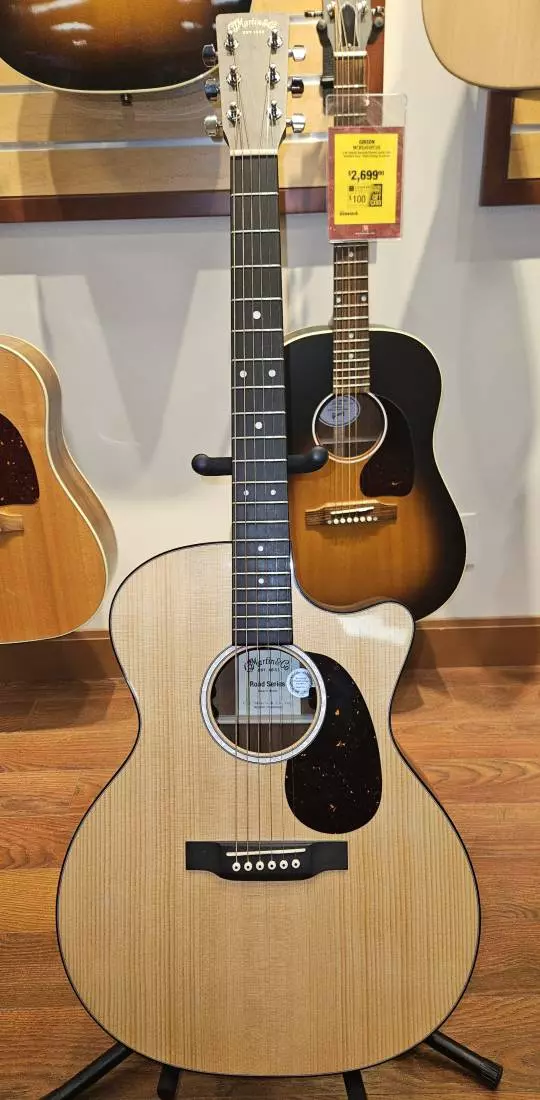 With a gorgeous glossed Spruce top and sapele back and sides, this solid wood Grand Performance model with cutaway is a great sounding guitar at an affordable price. New to this model are stunning mother-of-pearl pattern fingerboard and rosette inlays with a multi-stripe rosette border. It has an FSC Certified Richlite fingerboard and bridge, satin finish body, and a hand-rubbed neck finish. Also new to this model is the Martin E-1 electronics package with a built-in soundhole tuner that auto mutes the audio output so you can tune up any time without using a pedal. This guitar comes with a Premium Soft Shell Case so it is Road-ready to join you on all of your adventures!