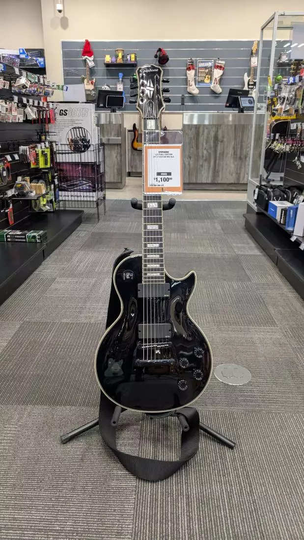 The nut, which is also black, is cut to 1 7/8" and the classic clipped dovewing headstock features the historic pearloid split-diamond Les Paul Custom inlay and a vintage style Epiphone logo in white. The bell-shaped truss rod cover is black with a shadow of white binding and MKH Les Paul Custom in white silk screen.
