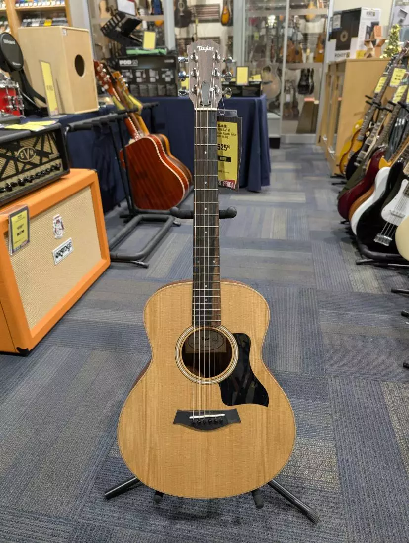 The 6-String travel-size GS Mini Sapele from Taylor features a Sitka Spruce top, Layered Sapele back and sides, Tropical Mahogany neck, Ebony fretboard and structured gig bag case.