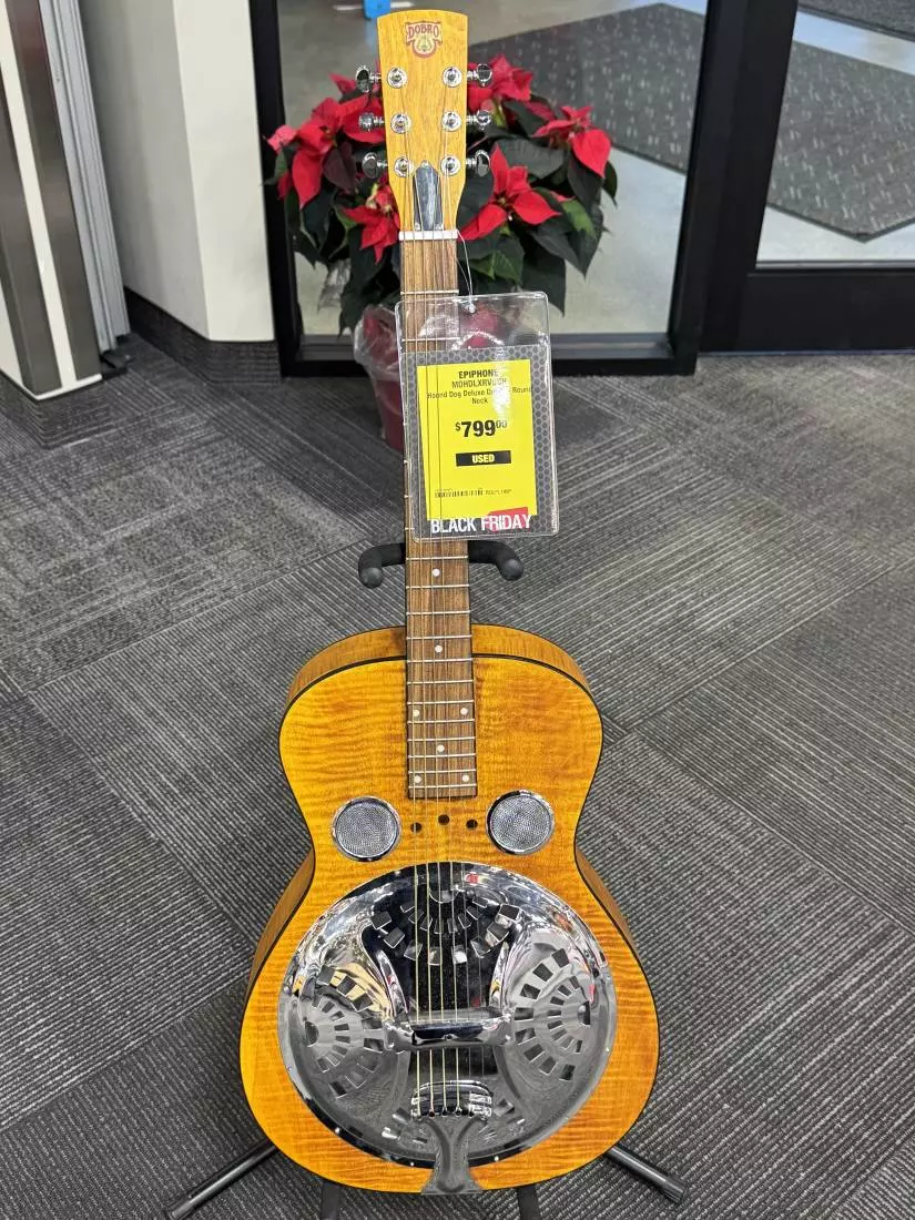 With its classic Dobro lines, fully bound, highly figured maple wood body, and classic single cone resonator/spider bridge construction, the Dobro Hound Dog Deluxe Roundneck is stunning in both appearance and tone. In addition to the bridges ebony saddle atop a maple base, the full, warm tone of the Hound Dog Deluxe Roundneck is enhanced and projected by a new proprietary Dobro cone and amplified via a Fishman resonator pickup. Combining classic construction with state-of-the-art electronics, the Hound Dog Deluxe Roundneck represents Gibson Originals deep respect for both the instruments history and the needs of todays players.