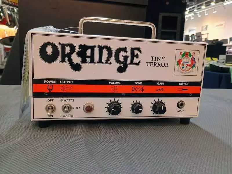 All valve, 15 watt portable guitar head. Featuring a unique two stage pre-amp which has a massive tonal range using just three controls. When driven, this little amp has almost as much gain as most four stage lead channels! The Tiny Terror puts a lot of high-priced, boutique amps to shame with its clean crunch to full on overdrive sounds. At mid gain settings this valve head has masses of vintage British character; the Tiny Terror has been built to the same rugged specification as the bigger Orange amps and its portability makes it perfect for gigging around town or rehearsing. The Tiny Terror switches from 15 to 7 watts for studio use and recording. This professional little amplifier is a record producer's dream and comes complete with a padded travel gig bag.