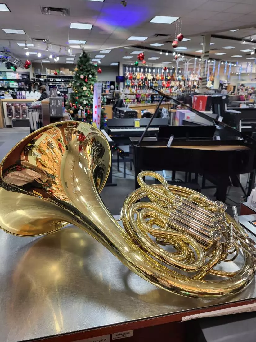 The YAMAHA YHR664 is a full double French horn that was produced from the late 1970s to the early 1990s. It is a yellow brass instrument with a Kruspe wrap and a medium throat. Comes in Yamaha hardshell case, 4 mouthpieces and mute.