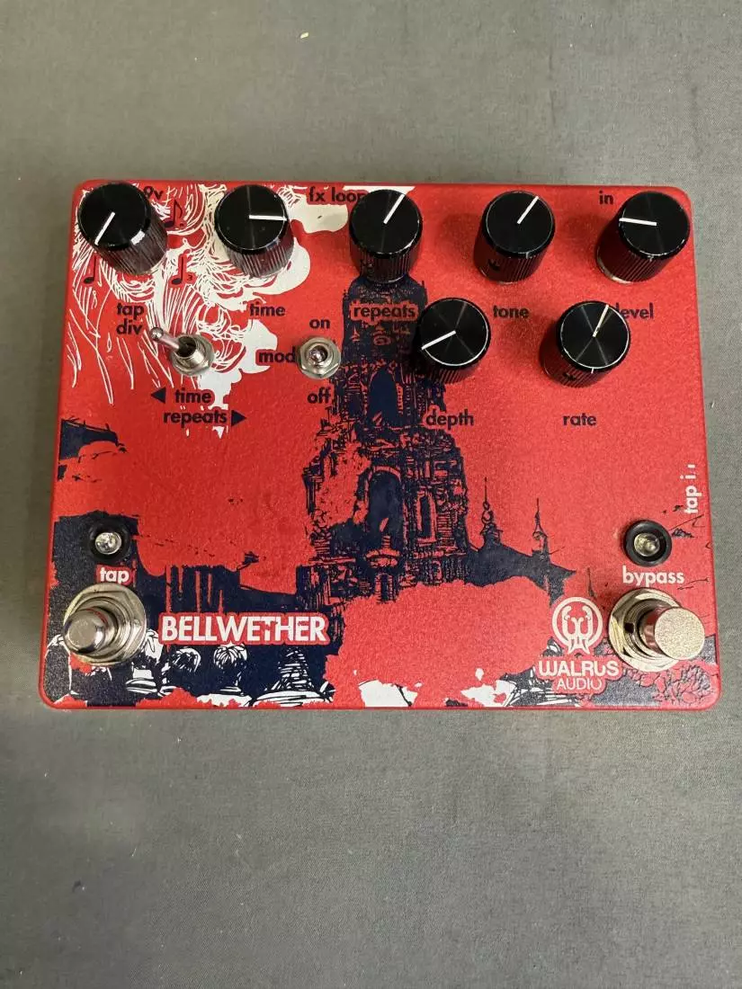 The Bellwether is a bucket brigade delay pedal with tap tempo. Offering analog circuity and up to 1000ms of lush delays, the Bellwether ushers in a rich soundscape of long and short trails. It can achieve the warm saturated sounds found in delays like the Maxon AD999 and the coveted Boss DM-2. Inversely, the repeats can also be brightened up with the tone control for more pronounced rhythmic delays. The Analog Chorus Engine allows you to manipulate the depth and rate of the chorus effect applied to your trails; creating a deep soundscape of ambient modulation. Set the time and repeat controls low to get that classic western slap back sound or drag them out to achieve shoegaze perfection. Take it all the way to 10 to achieve a self-oscillating delay.