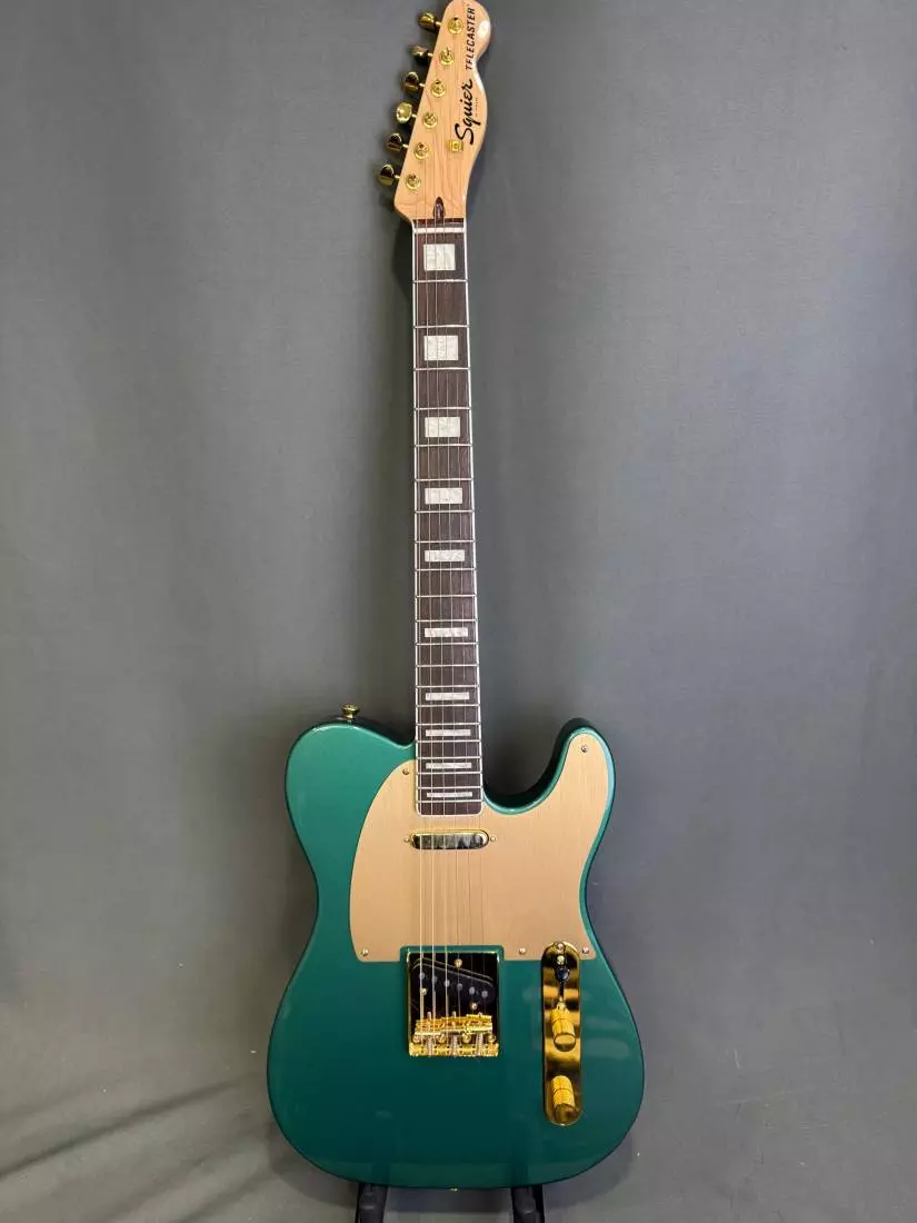The Squier® 40th Anniversary Telecaster®, Gold Edition is a stylish model adorned with an eye-catching collection of upscale features for the discerning Squier fanatic. Featuring striking gold-plated hardware, a gold anodized aluminum pickguard, a bound Indian laurel fingerboard with pearloid block inlays, an engraved anniversary neck plate and gloss finish throughout, this Tele® is poised and ready for the spotlight. Player-friendly refinements of this commemorative model include a slim and comfortable "C"-shaped neck profile for an easy playing feel, vintage-style tuning machines and 3-saddle string-through-body bridge for authentic performance and style, and Fender-Designed single-coil pickups with alnico 5 magnets for familiar Tele tone.