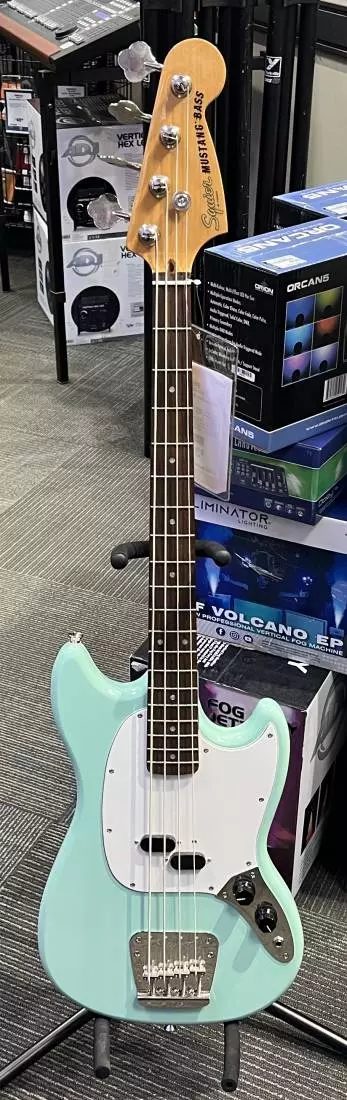 While small in stature, the Classic Vibe '60s Mustang® Bass packs a punch of incredible tone courtesy of the Fender-designed alnico split-coil pickup. Small hands will appreciate the short 30" scale length and slim, comfortable "C"-shaped neck profile with an easy-playing 9.5"-radius fingerboard and narrow-tall frets. This throwback Squier model also features 1960s-inspired headstock markings, rich-looking nickel-plated hardware and a slick vintage-tint gloss neck finish for an old-school vibe.