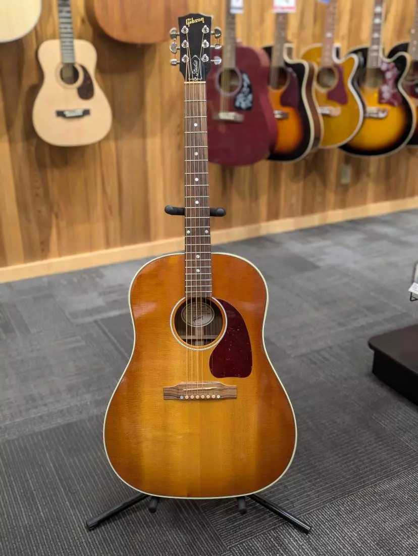 Turn heads with this unique J-45 Studio, hand-built using rosewood back and sides with a Sitka spruce top. The slim body depth allows for increased comfort underarm and the flatter fingerboard allows a finer playability. Available in both Antique Natural and Rosewood Burst finishes, as well as lefty! Finished with an active under-saddle piezo pickup for easy studio quality plug and play anywhere.