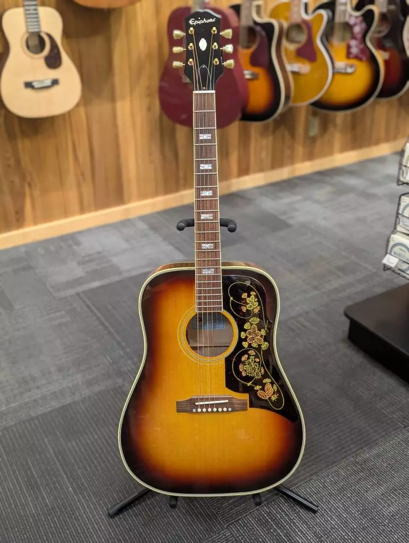 Gibson™ manufactured the original Epiphone Frontier in its Kalamazoo factory from 1958 until 1970. Now the FT-110 Frontier is being made in the USA once again, and is proudly handcrafted in Bozeman, Montana, by Gibson's finest acoustic luthiers. Featuring a solid Sitka spruce top and solid figured maple back and sides, Indian rosewood fretboard, traditional hand-scalloped X-bracing, gold-plated Gotoh Keystone tuners, the iconic "lariat and cactus" themed pickguard, and a 25.5" scale length for a powerful tone. It comes equipped with an L.R. Baggs VTC pickup, so it is stage and studio-ready, right out of the included hardshell case.