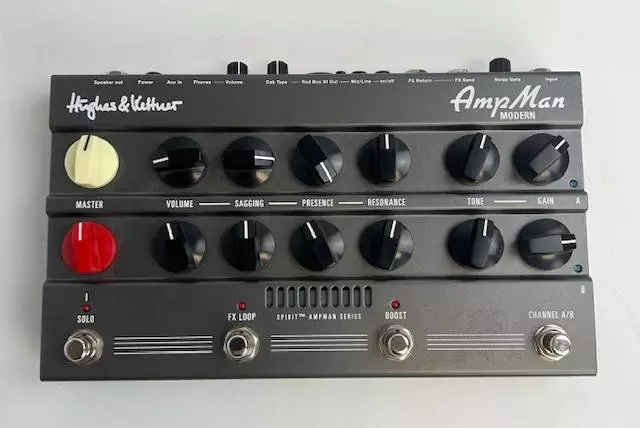 Hughes & Kettner's all-analog Spirit Tone Generator is now available in a compact pedal format. AmpMan Modern's two distinctive channels each embody an entire era of legendary guitar tones, served up by the built-in 50-watt power amp or the integrated Red Box AE+. With connoisseur tone-shaping capabilities, impressive power and a comprehensive set of professional features in a handsome little box, AmpMan is the go-to solution on stage, at home and in the studio.