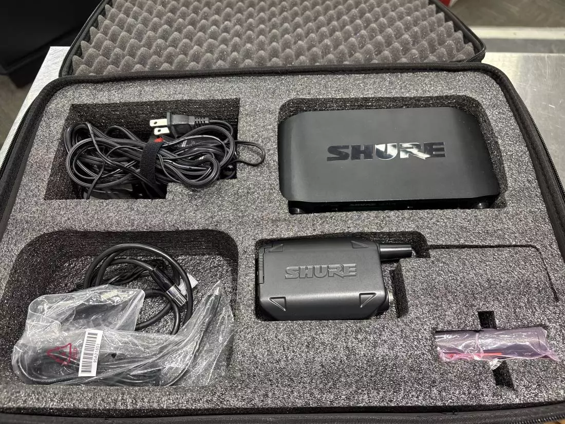 Includes GLXD1 bodypack transmitter, GLXD4 receiver, WA302 instrument cable, rechargeable battery, power supply, USB cable, carrying case, and user guide.