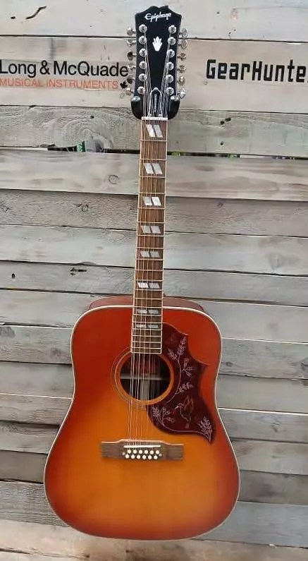 Inspired by the iconic Gibson™ Hummingbird acoustic, the Epiphone Inspired by Gibson™ Hummingbird™ 12-String produces a clear, bright tone with a beautifully balanced sonic range and comes equipped with a unique Hummingbird pickguard. The Epiphone Inspired by Gibson Hummingbird 12-String has a solid spruce top, solid mahogany back and sides, dovetail neck joint, bone nut and saddle, Fishman® Sonitone™ pickup system, and an aged vintage gloss finish.